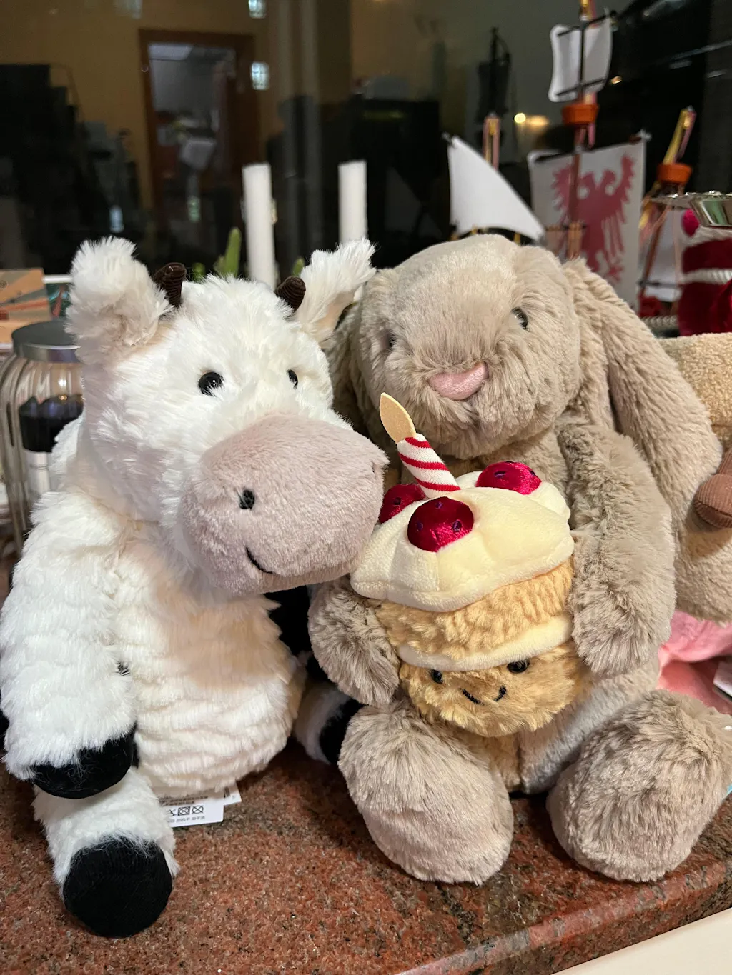 velveteen strawberries, and a striped candle already lit with a suedette flame.